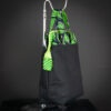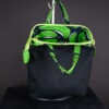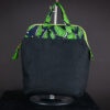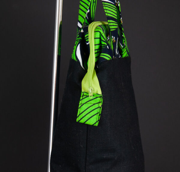 Sac vert et noir en lin et en wax. Il s’ouvre à l’aide d’une fermeture éclair. Il est doublé en tissu wax et possède une petite poche intérieure. Il mesure 27 cm/25 cm, la largeur est de 11cm. Les anses sont en wax et mesurent 28cm.
